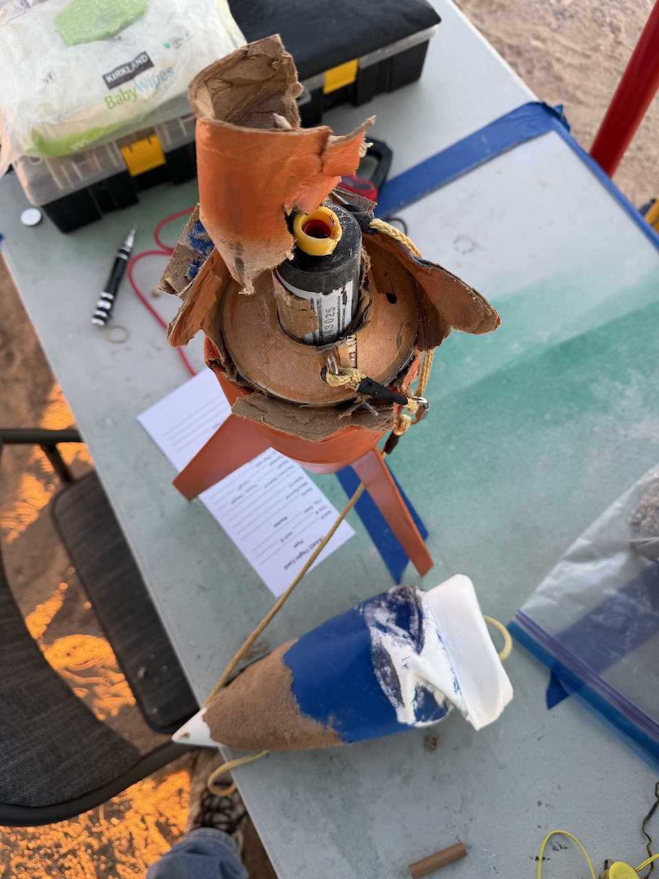 Good flight until no motor ejection. 1 gram of Black Powder was used. Recovered motor showed red cap still in place. Looks like the delay grain didn't burn; can see in image after removing cap.