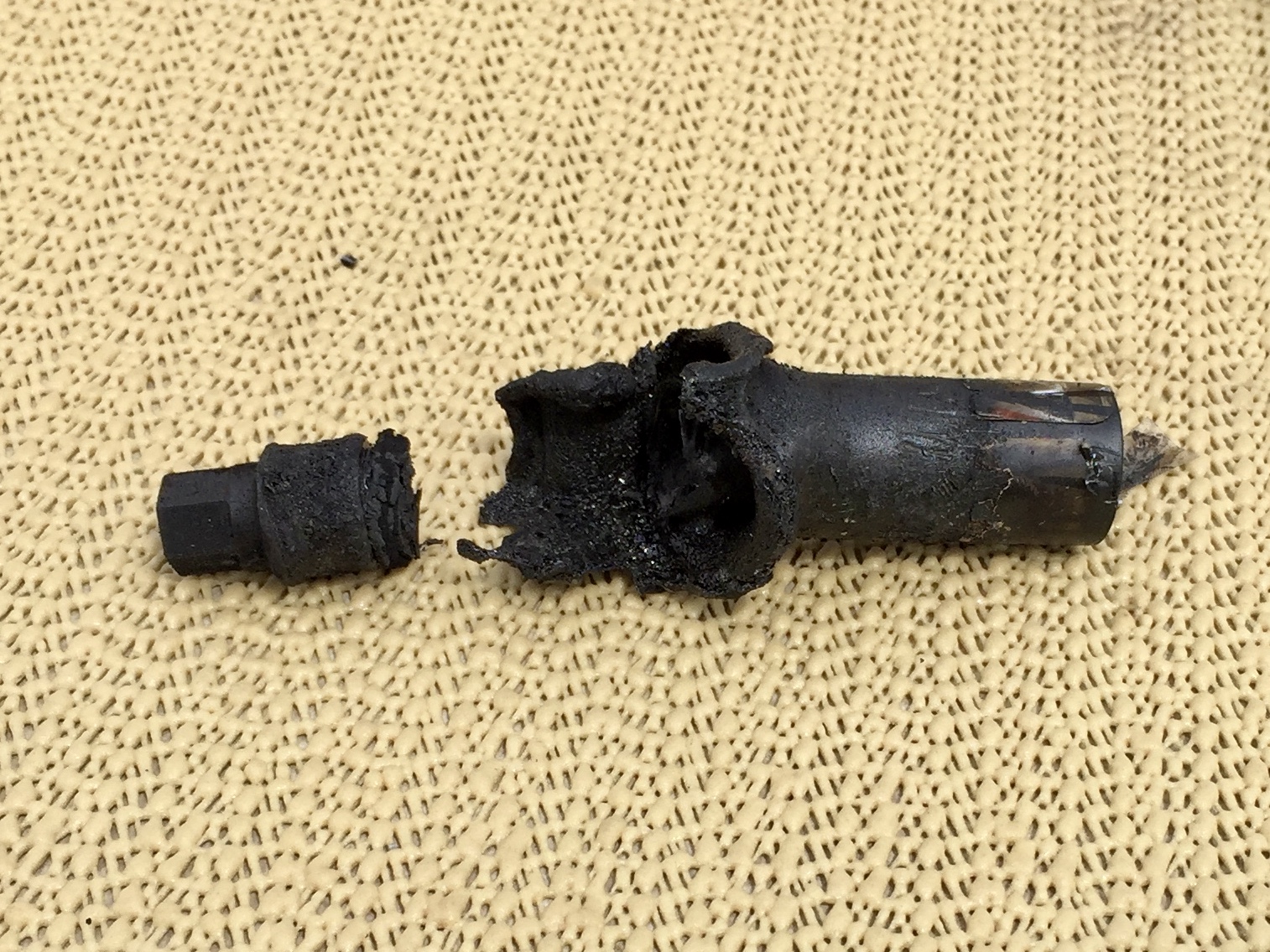 This motor has only a 0.8s burn time, it failed when the rocket was less than 100' in the air, so failed before or just at burnout. Entire top half of casing was burst open.
