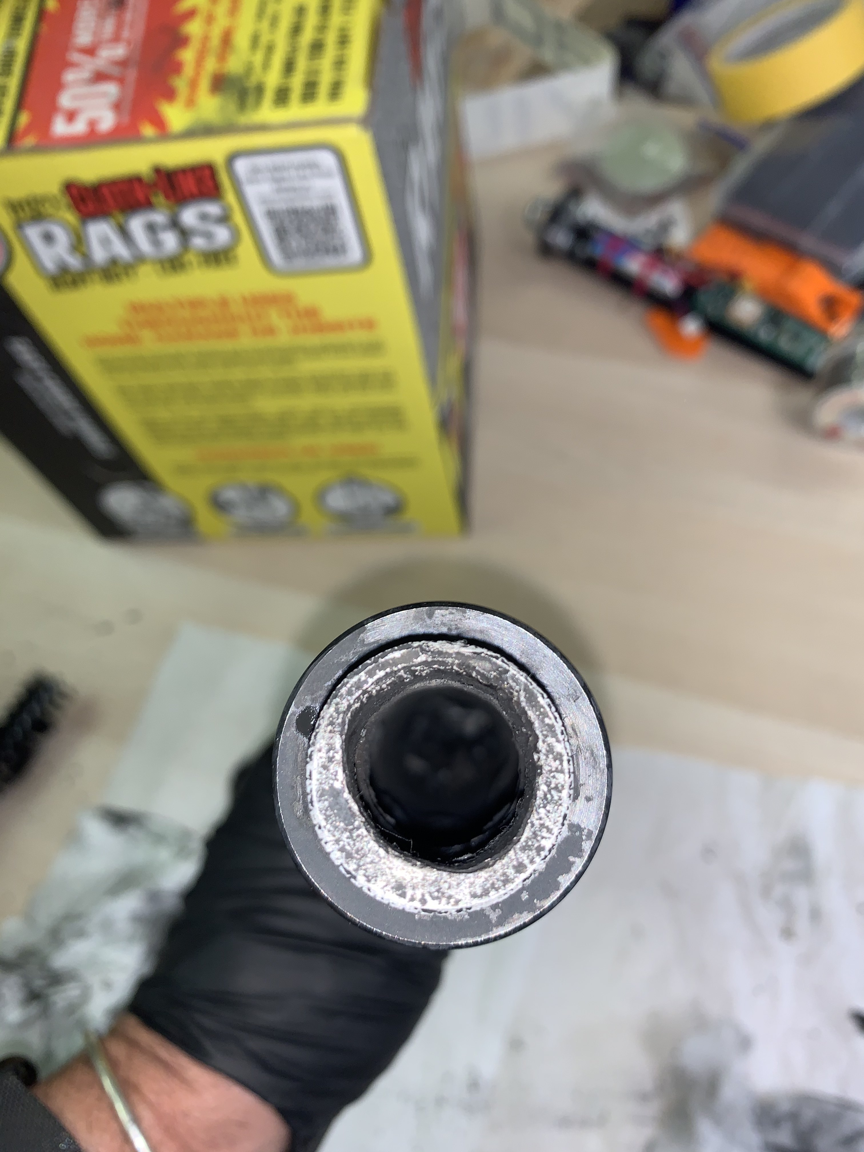 Burn-through of forward closure/ejection charge cup. Liner burned through between top grain and adjoining grain, front seal disk hole enlarged significantly (it's now a ring). Delay grain, delay grain spacer, insulator, and o-ring all vaporized. Frame-by-frame video analysis shows smoke coming out the top end of the booster while it was climbing the rail, so it was happening quickly. I have several more pics