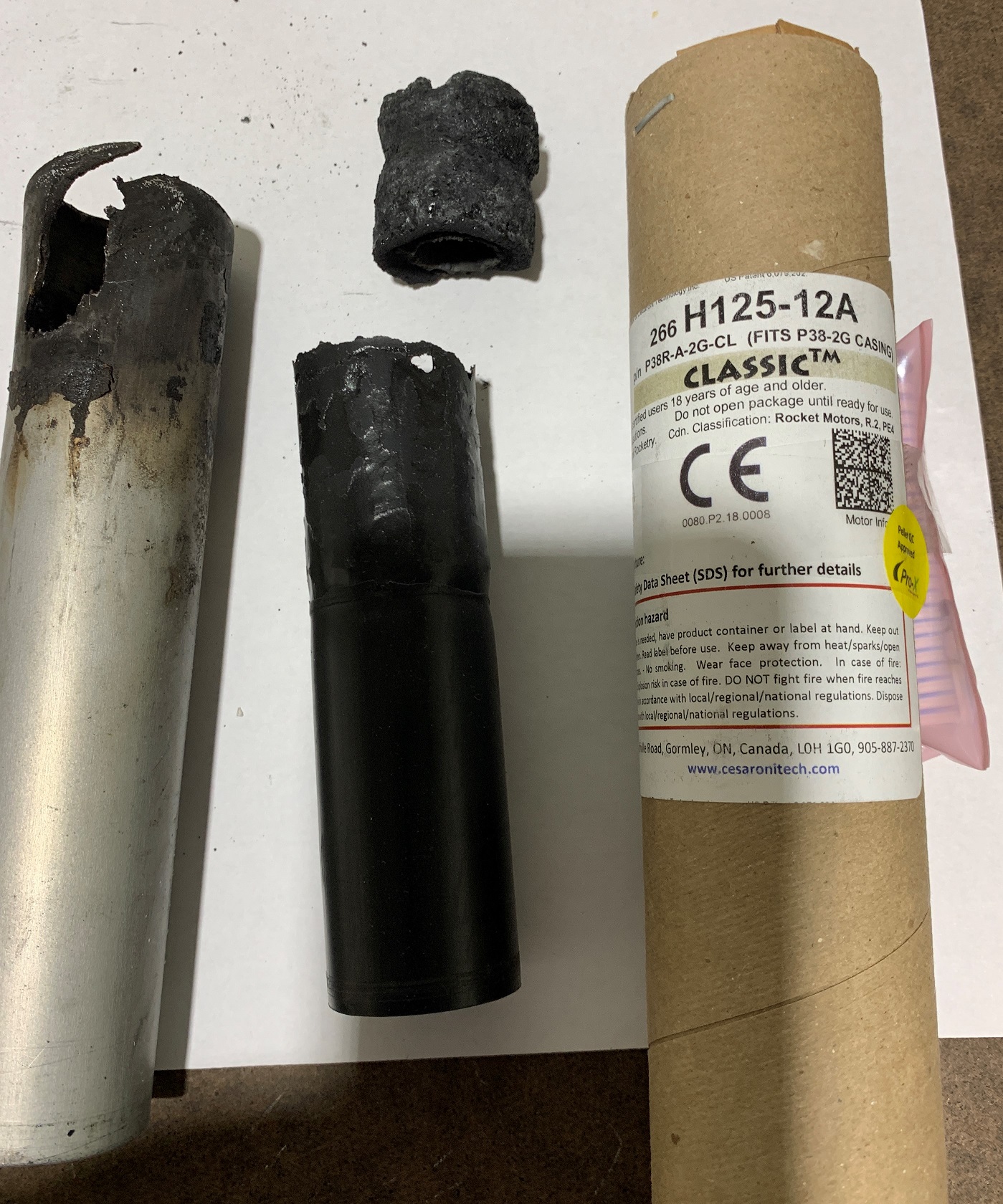 Motor lifter the rocket off the pad but near the end of the burn, burned through the casing. On 10/24/2020 we had a 50% failure rate where 3 of 6 motors experienced this exact failure. Contacted Robert Dehate and describe the failure. He instructed us to apply a small amount of epoxy to the forward surface of the top grain to inhibit the burn. No further failures after this modification was done