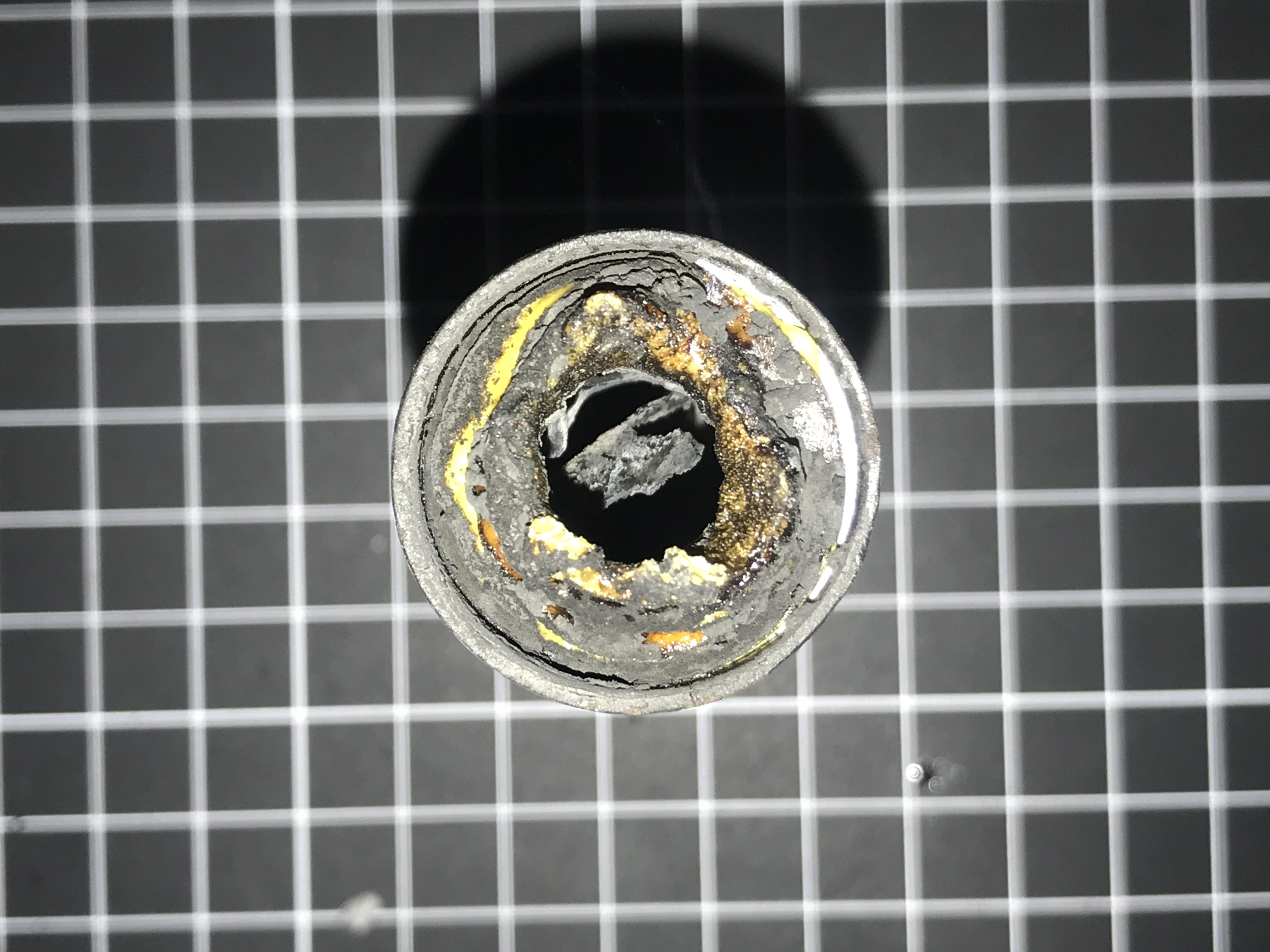 At launch, immediately after leaving the rail, the nose cone popped off and began emitting dark black smoke from the forward section of the rocket. It made multiple chuffing noises until the parachute finally released from the body tube and immediately burst into flames. Video of the incident can be viewed at https://youtu.be/INdY7hRLnJw. Inspection of the motor showed the epoxied Forward Closure remained in place and the center section housing the delay grain and delay charge was completely destroyed.