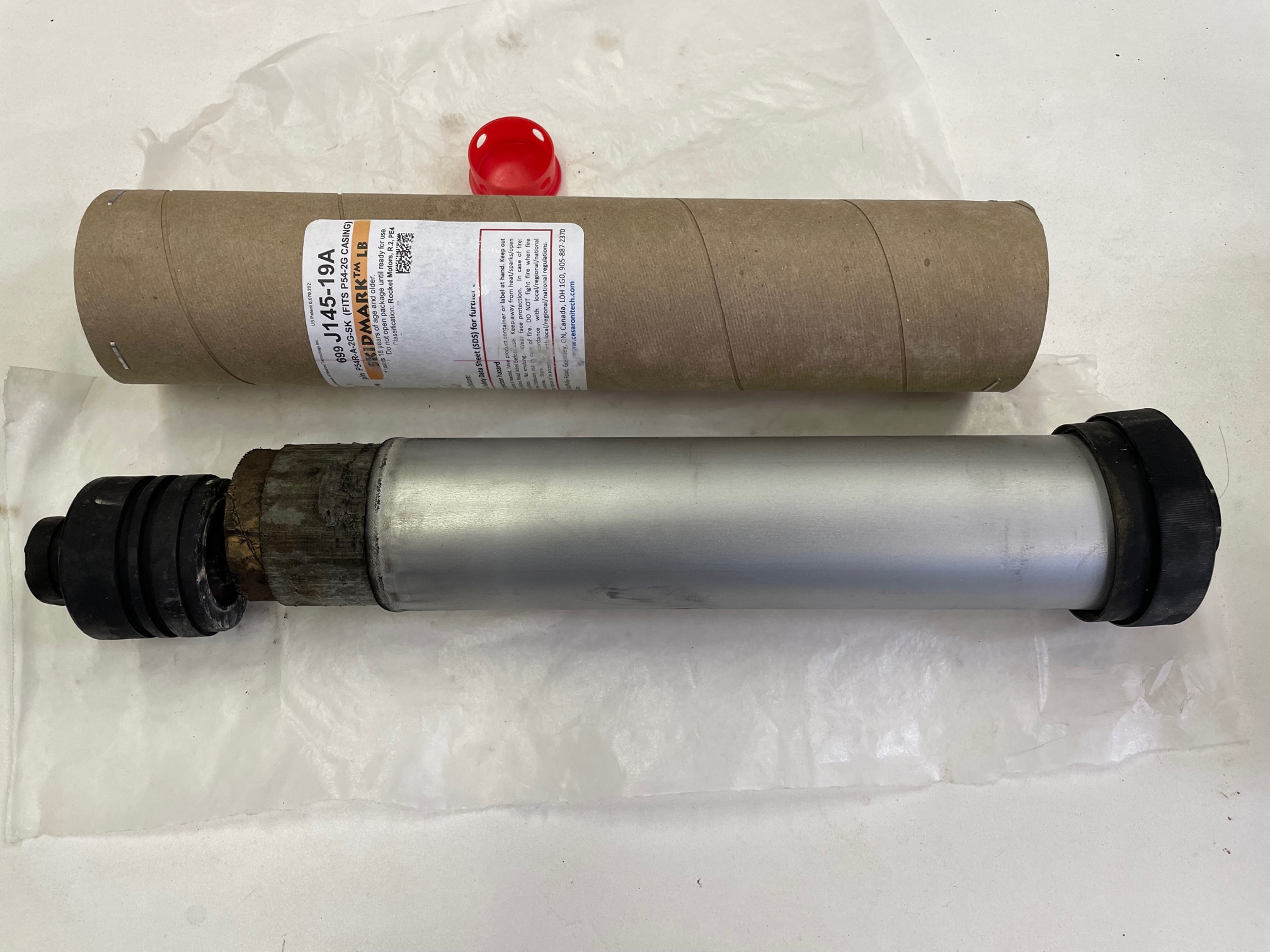 Motor CATO'd on the launch rail a fraction of a second after ignition. The forward closure was blown out of the motor casing. The recoil caused the Aero Pack motor retainer to dis-bond and crushed the retaining ring against the launch pad standoff.