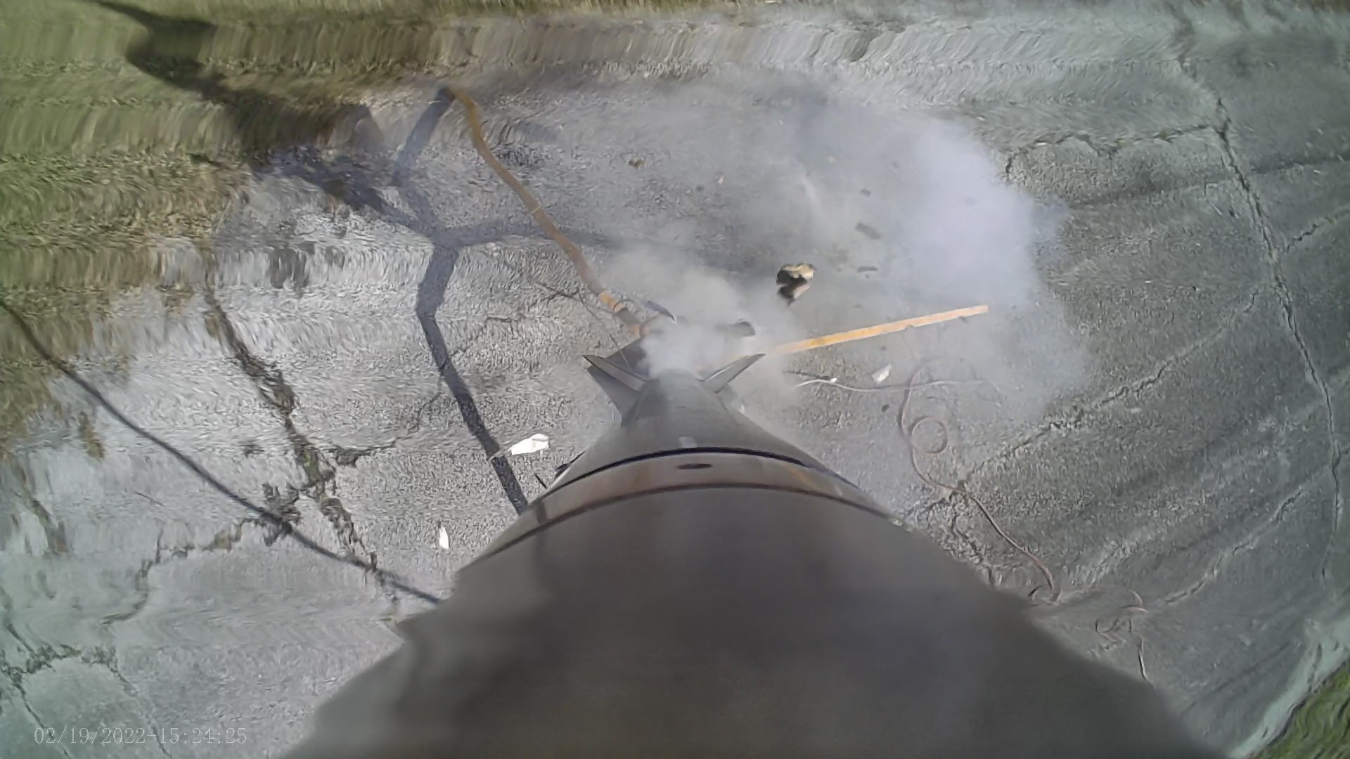 At ignition, the motor blew out the nozzle and aft closure sending the rocket approximately 40 feet up which then crashed onto pavement causing severe damage.