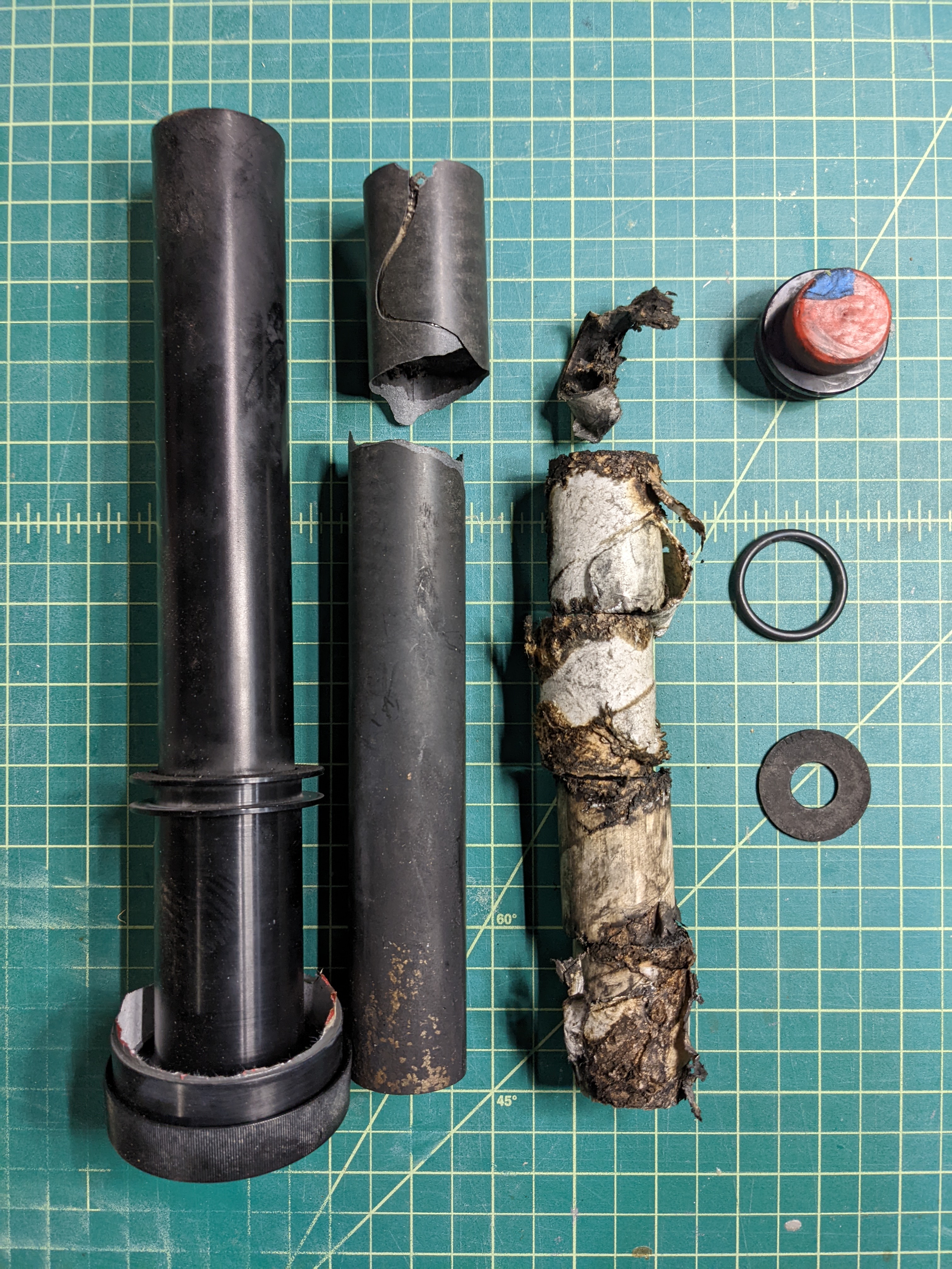 After inspection, it appears that both the aft and forward closure were subjected to an over-pressurization. The aft closure appears to have been forced backward, forcing the motor retainer and motor mount adapter ring to buckle and ultimately tearing the end of the motor mount completely off. Meanwhile, the forward closure was completely ejected from the front of the casing and continued up through the airframe until impacting the aft bulkhead of the avionics bay. Inspection of the forward section of the motor case shows bulging where the forward closure was ejected. All the propellant grains were recovered with, it appears, considerably little propellant actually burned (after the payload ejection, the smoke completely stopped and the propellant did not continue to burn). The aft insulator and forward o-ring were recovered. The aft o-ring is presumably still inside the motor case with the nozzle (the aft assembly is not removable in its current condition). The forward seal disk and o-ring were not recovered despite a lengthy search around the launch site.