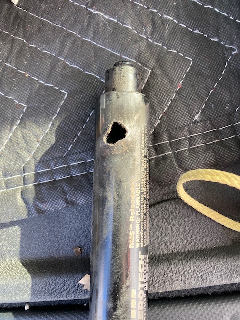 Essentially exploded on launch, burned through liner, casing and exploded out through composite body tube