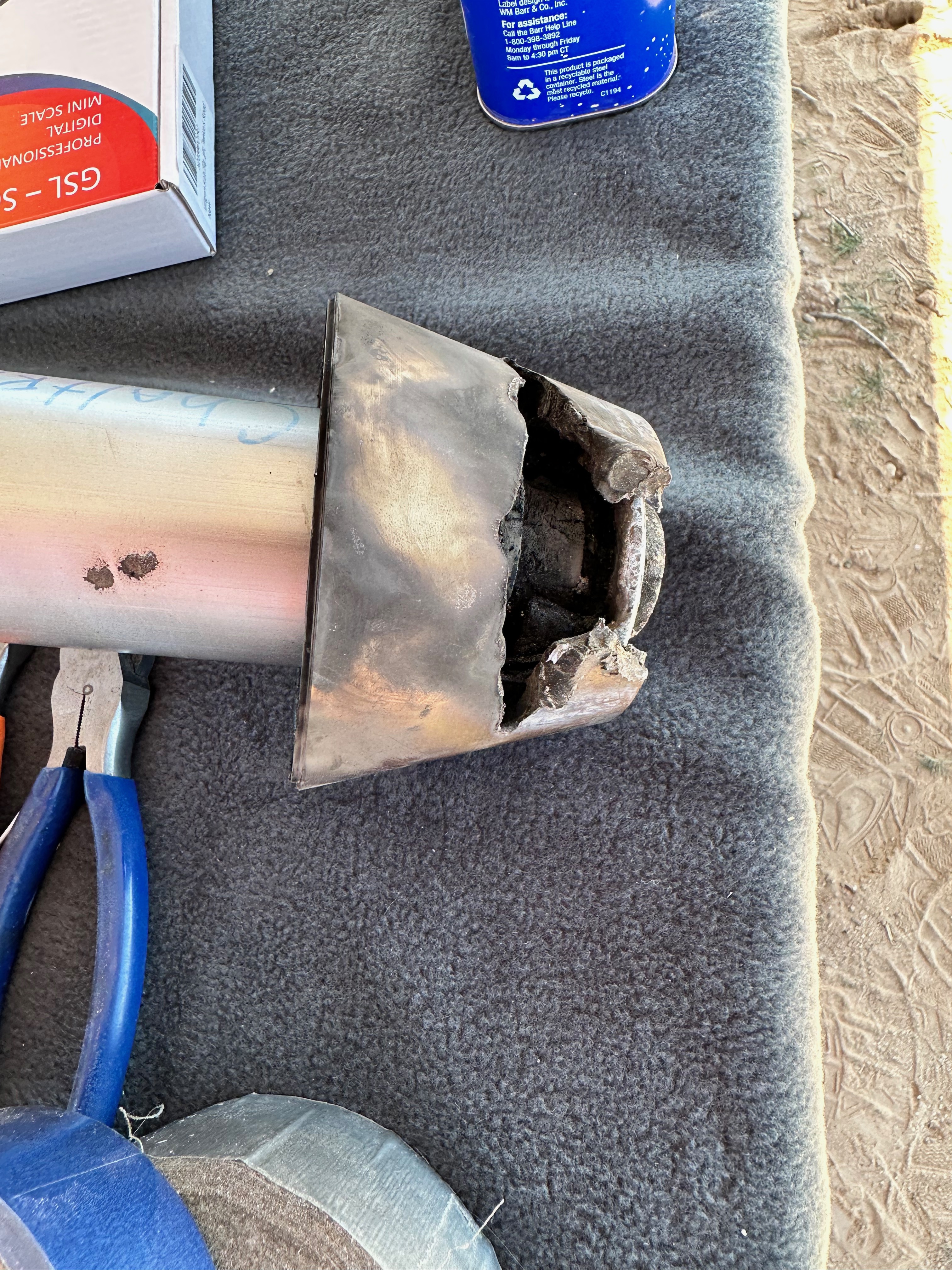 The engine was perfect until 3080 feet in elevation, then the rocket took a hard 90-degree turn and flew another 2000 feet horizontal. When I located the rocket, the case had been burned through at the aft section, and the stainless enclosure ring, and the boat tail retainer was melted and fused.