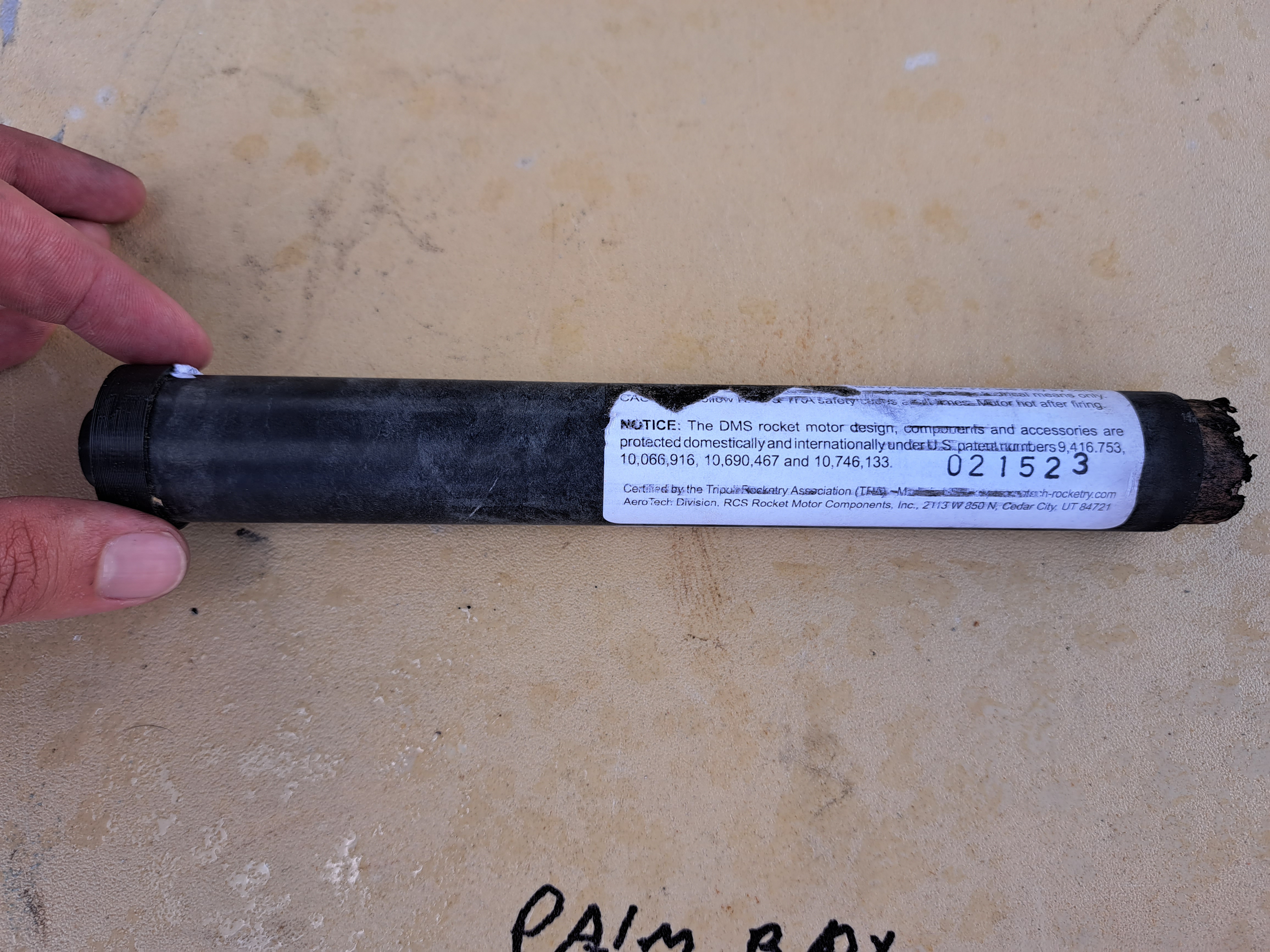The motor burned for approximately 1/4 second before failure. During preparation I noticed a sticky residue at the forward closure which may be indicative of improperly cured epoxy.