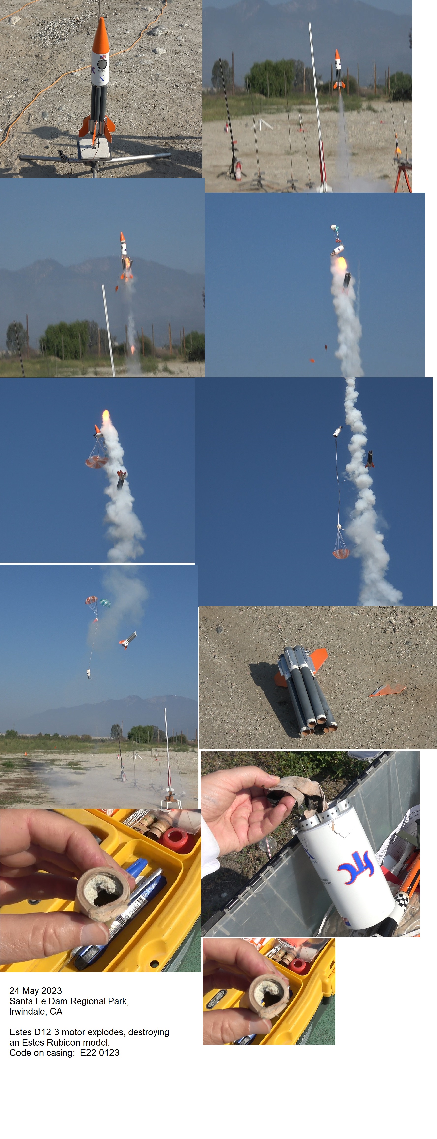 Burnt for less than a second before propellant exploded. Burst main body tube. Sent fireball into the air. Recoil from explosion was powerful enough to shoot motor casing downward out of mount despite motor retaining hook. Ceramic nozzle of motor half blown away. Inside of casing has only white and gray powdery residue, no soot. No propellant, delay, or ejection charge remains are left.