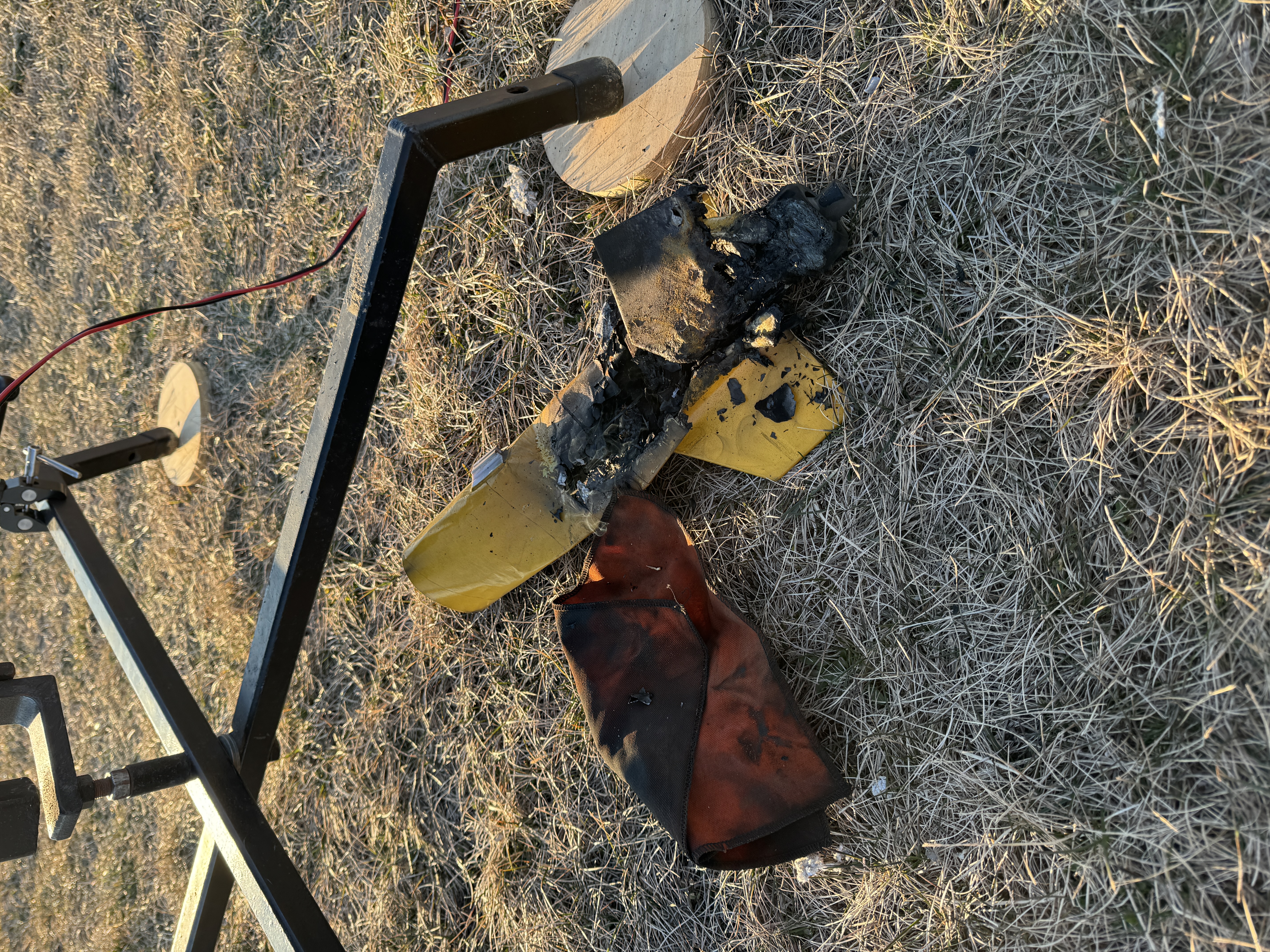 Motor ignited and burned normally for a moment allowing the rocket to travel up the rail a little bit before we believe the ejection portion of the motor got seperated and due to this the propellent started burning outwards on either side of the rocket. This resulted in the rocket and motor getting burned up.