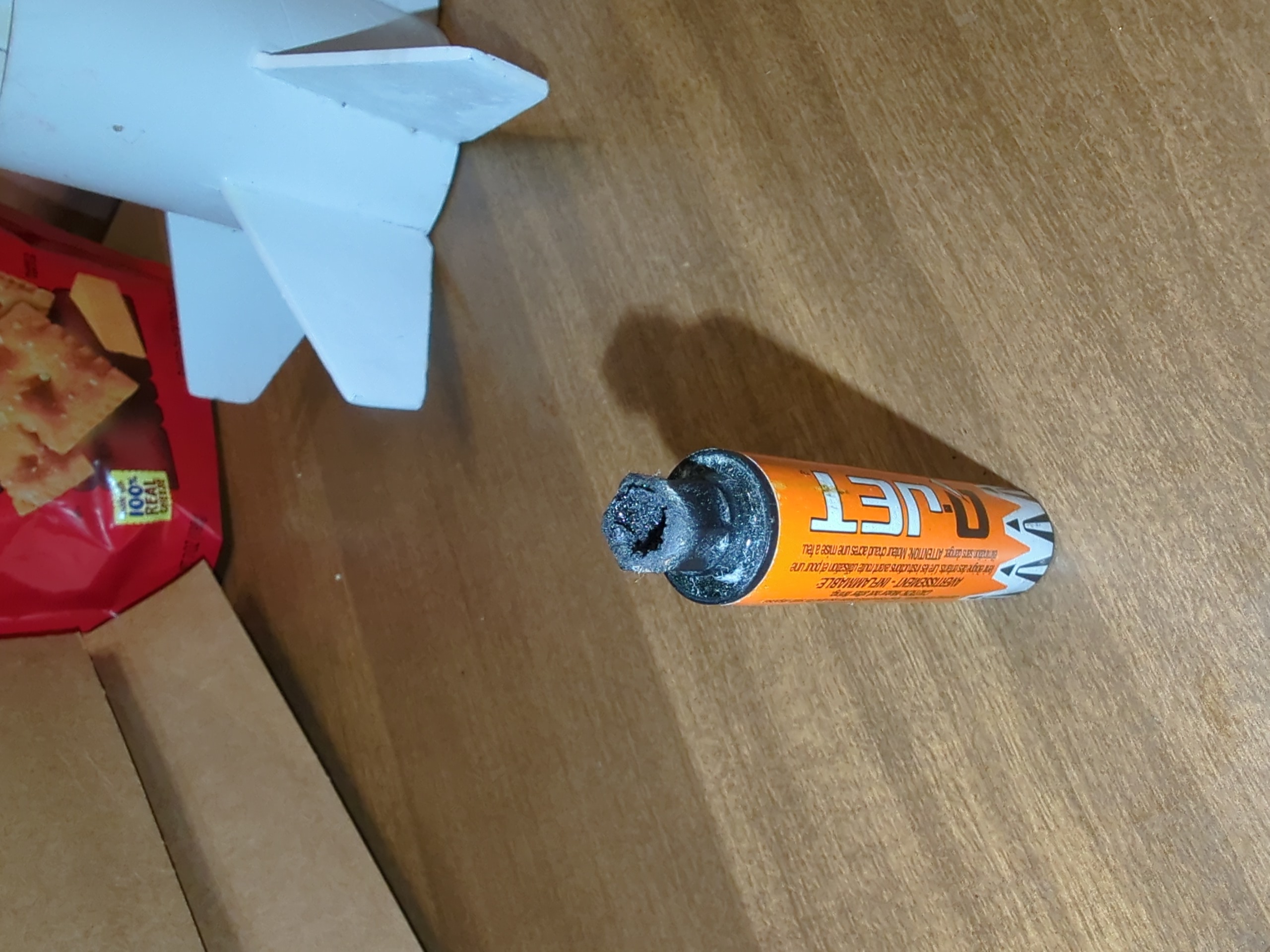 The motor smoked (not chuffed) before coming up to pressure. Once the rocket was in motion, the nose and streamer were ejected almost immediately while the motor was still producing thrust. Flame came out the top of the rocket, and the rocket came down smoking.