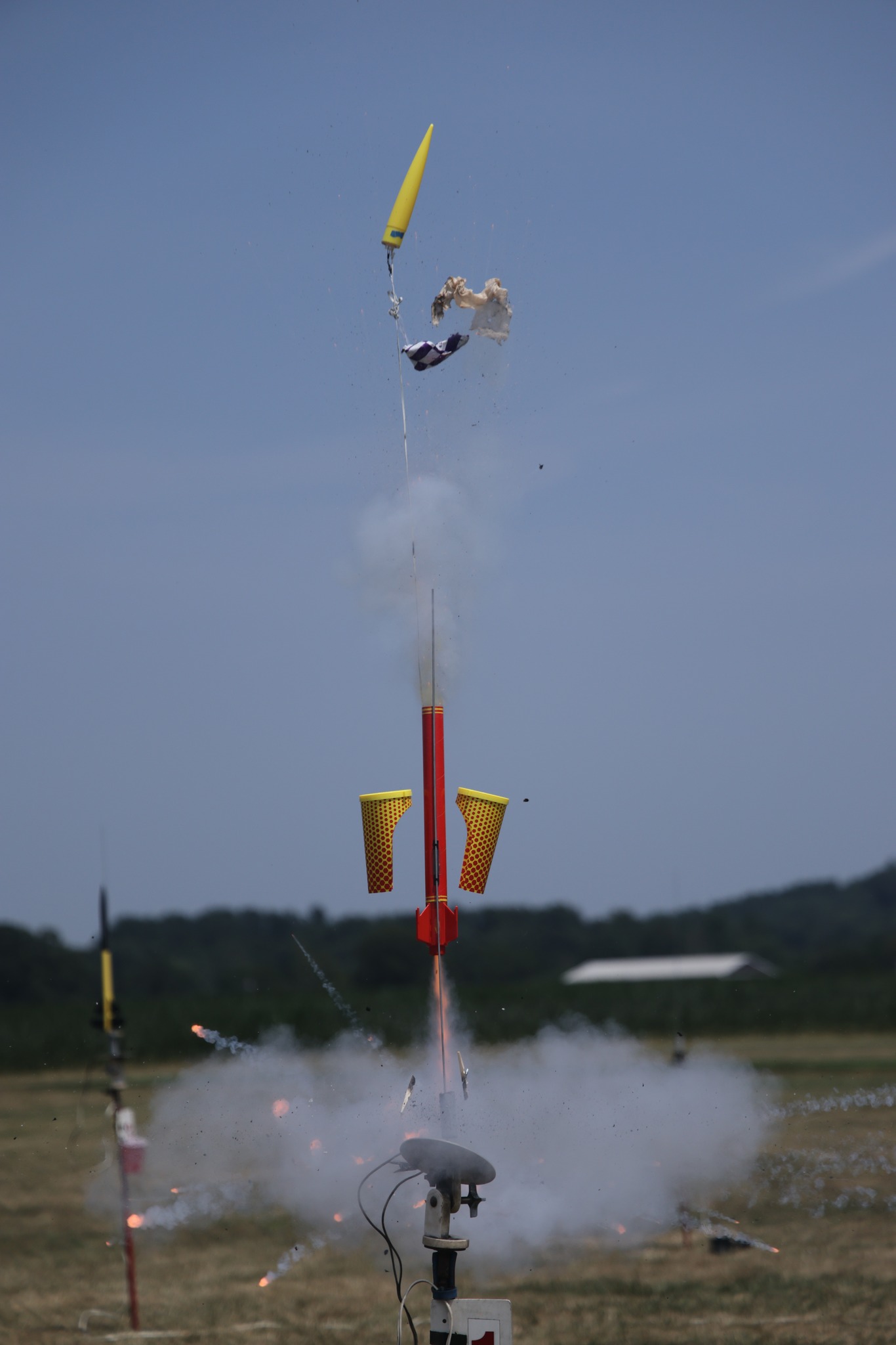 Ejection charge appears to have ignited at the same time as the thrust end of the engine - photos show flames coming out the top of the body tube, ejecting the nose cone and parachute, with the rocket being only 10-12" above the blast deflector. Later photos show flaming chunks coming out the bottom end of the rocket. Casing was completely empty when retrieved and exterior of the casing looked fine.
